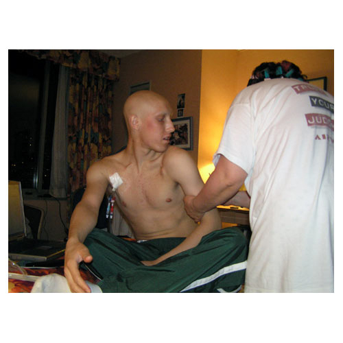 The treatment uplifted our family from Colorado to the Ronald McDonald House of New York City. We lived in a tiny room there together for five months. Here, in the midst of winding down for the night and preparing for bed, my mother injects David with his booster shot of Nuepogin. The drug is designed to stimulate the bone marrow, an area drastically depleted by long-term dosages of chemotherapy. As the production area of the body's white blood cells, healthy bone marrow is the most vital agent in fighting off infection and building immunity. The side effect: A constant aching and throbbing sensation throughout the bones and joints.
