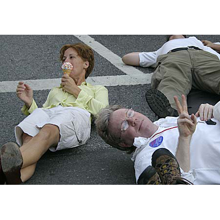 The next day, the War Resisters’ League planned to march from Ground Zero to Madison Square Garden, where they would conduct a die-in. Two hundred of their number were arrested before they could begin their action; those left pressed on regardless. At 28th & Broadway, their path blocked by the cops, they lay down in the street. One bystander, a Republican perhaps, chose to mock their civil disobedience. Ice cream in hand she lay down next to them, reclining luxuriously on the tarmac, a big grin on her face. When she decided she’d derided them enough, she got up to leave. The cops, who by this time had formed a tight net around the protesters, pushed her back behind their cordon and she too was arrested. I wonder how she’ll be voting in November.